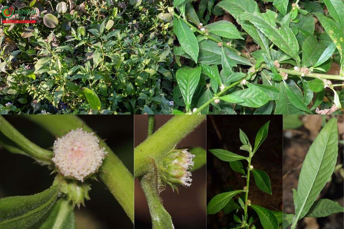 Cụm hoa mọc riêng lẻ ở nách lá, tụ lại thành đầu tròn nhỏ, đường kính khoảng 6–8 mm. Hoa đều là hoa hình ống, màu trắng, vòi nhụy có sắc tím. Quả thuộc loại quả bế, hình trụ hơi cong, màu trắng; bầu quả mang 5 răng dính liền, tạo thành dạng như chiếc chén. Cây ra hoa và kết quả chủ yếu trong khoảng từ tháng 4 đến tháng 10.