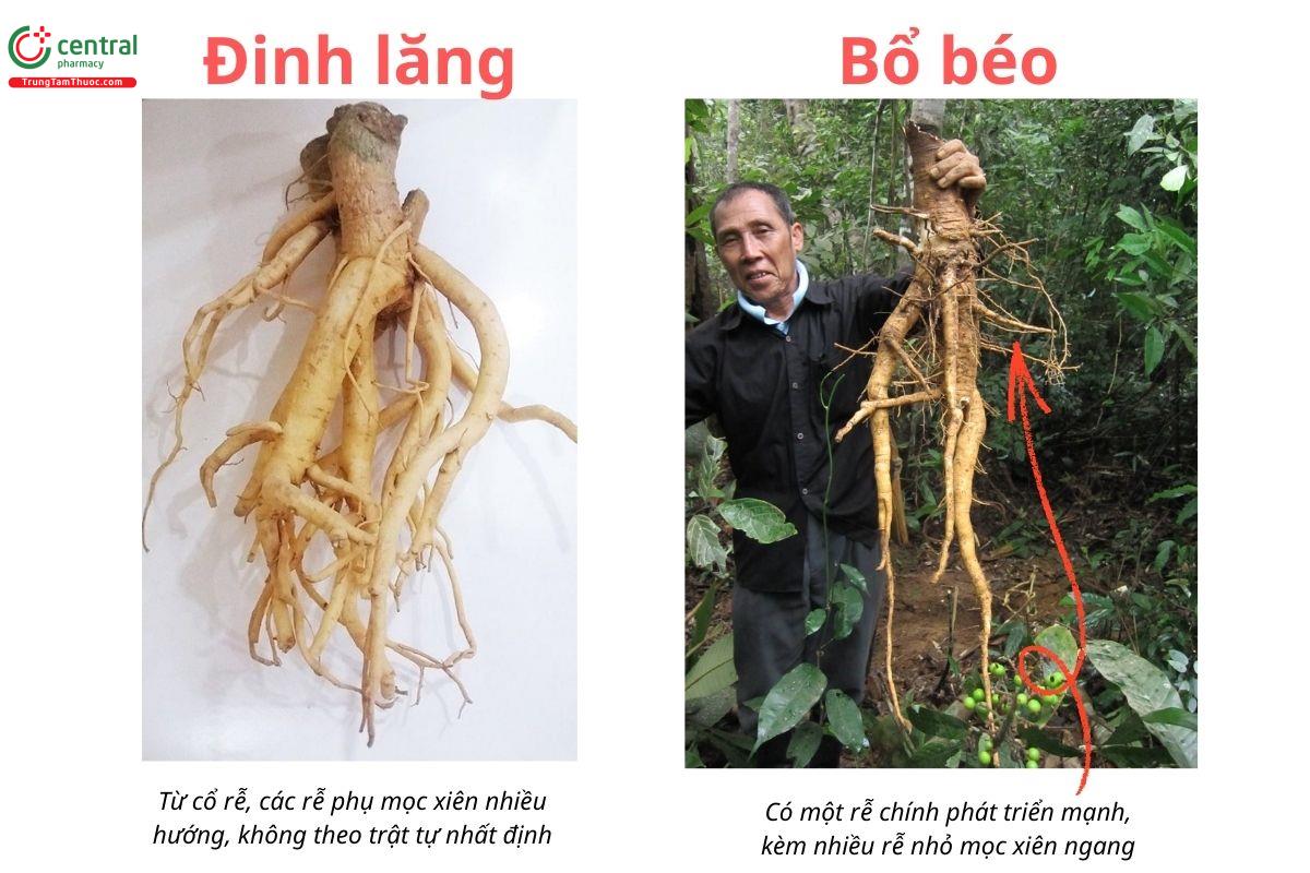 Đinh lăng thật thường có kích thước vừa phải, không quá to, và có thể nhận biết thông qua đặc điểm hình thái của bộ rễ. Ở cây Đinh lăng thật (Polyscias fruticosa), từ phần cổ rễ sẽ phát sinh nhiều rễ phụ mọc tỏa ra các hướng khác nhau, sắp xếp tự nhiên, không theo trật tự cố định. Ngược lại, “Đinh lăng rừng” thực chất là Bổ béo trắng có cấu trúc rễ khác hẳn: nổi bật là một rễ chính phát triển to và khỏe, kèm theo nhiều rễ nhỏ mọc xiên ngang.