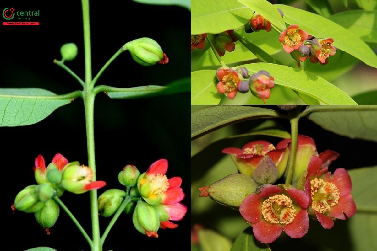 Hoa mọc đơn lẻ hoặc thành cụm nhỏ từ 1 đến 4 hoa, có màu đỏ điều, bề mặt nhẵn, không có lông. Cuống hoa dài tương đương cuống lá. Cánh hoa thon hẹp, chiều dài trung bình khoảng 9 mm, không có vảy tiết. Bộ nhị tụ lại thành ba bó rõ rệt. Vòi nhụy gồm ba nhánh, bầu noãn mang hình nón đặc trưng.