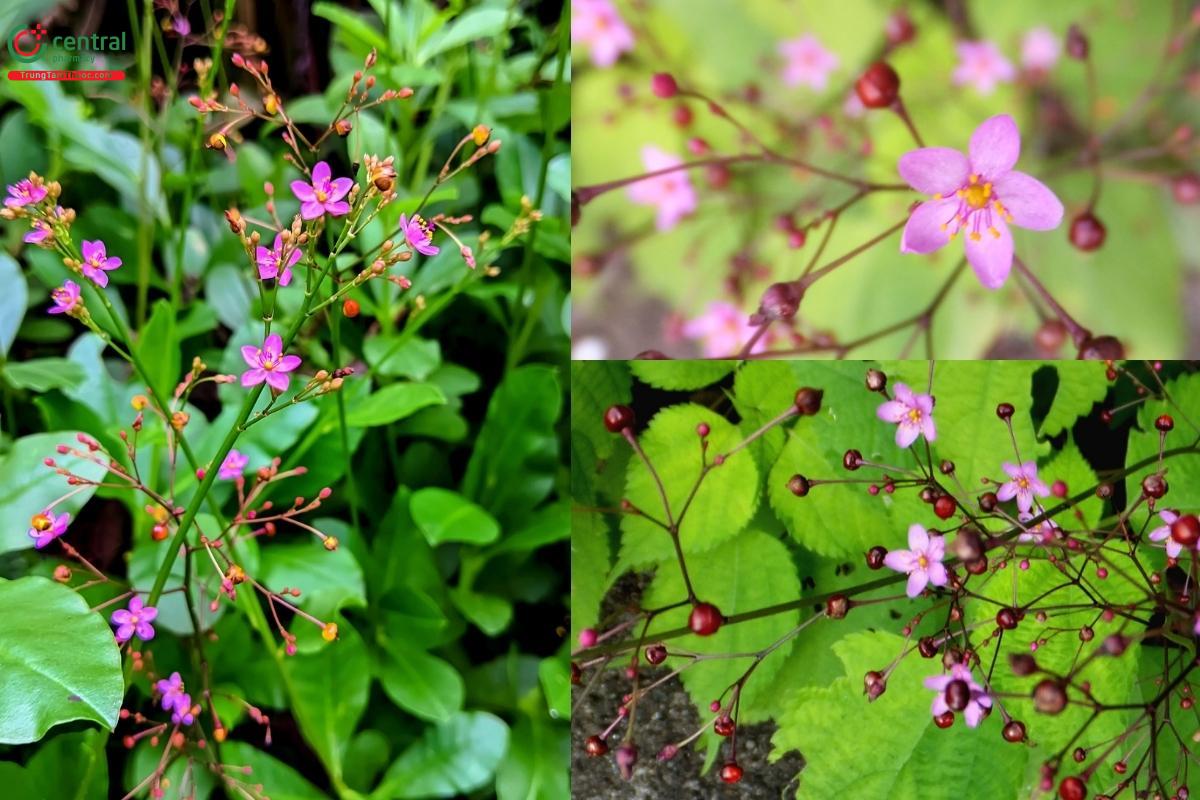 Vào mùa hè, ở ngọn và đầu cành hình thành các cụm hoa dạng chùm, gồm nhiều hoa nhỏ. Hoa có đường kính xấp xỉ 6mm, gồm 5 cánh mang màu tím đỏ nhạt hoặc hồng; bộ nhị phát triển với trên 10 nhị, mỗi nhị dài khoảng 2 mm. Bầu hoa có dạng gần tròn. Quả nhỏ, khi chín chuyển sang màu xám tro, đường kính khoảng 3 mm. Hạt rất nhỏ, màu đen sẫm, hơi dẹt, bề mặt có các vân nổi nhẹ.