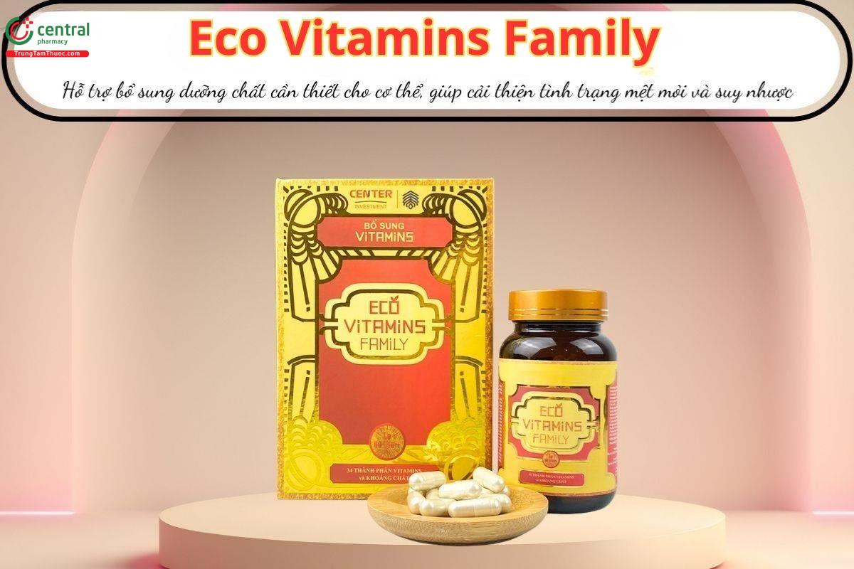 - Eco Vitamins Family cung cấp nhiều vitamin và khoáng chất thiết yếu, giúp hỗ trợ bổ sung dinh dưỡng hằng ngày cho cơ thể.