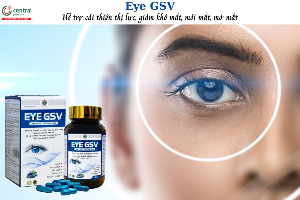 - Eye GSV bổ sung các dưỡng chất cho mắt, giúp duy trì đôi mắt sáng khỏe, cải thiện tình trạng khô, mỏi và nhìn mờ.