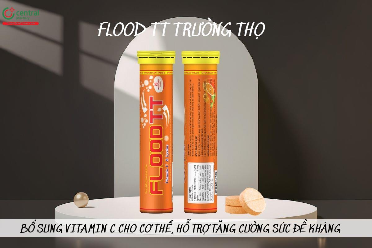 - Flood TT Trường Thọ có công thức gọn với Vitamin C và Lysine, dạng viên sủi giúp sản phẩm dễ uống hơn viên nén thông thường, đặc biệt hợp với người ngại nuốt dạng viên.