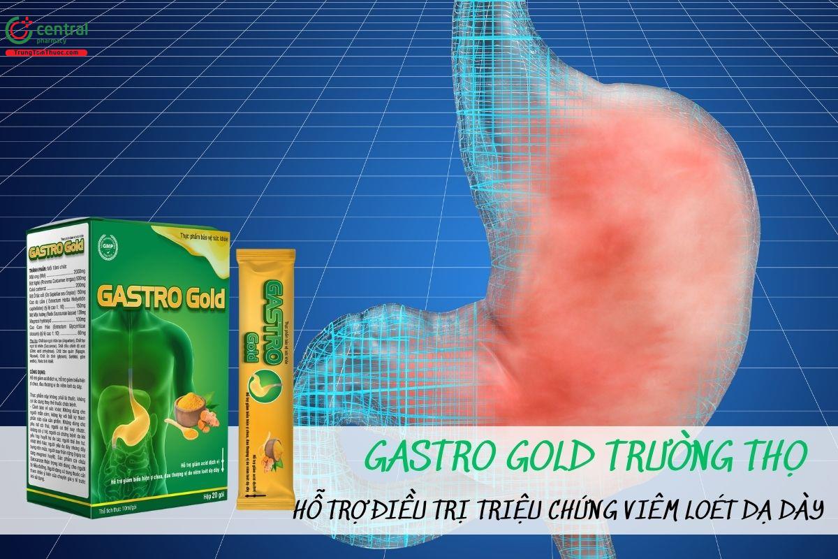Thuốc Gastro Gold Trường Thọ là thuật ngữ không đúng, đây không phải là thuốc mà là thực phẩm chức năng với công dụng hỗ trợ giảm acid dịch vị, giảm các triệu chứng của bệnh viêm loét dạ dày như ợ hơi, ợ chua, đau vùng thượng vị.[1]