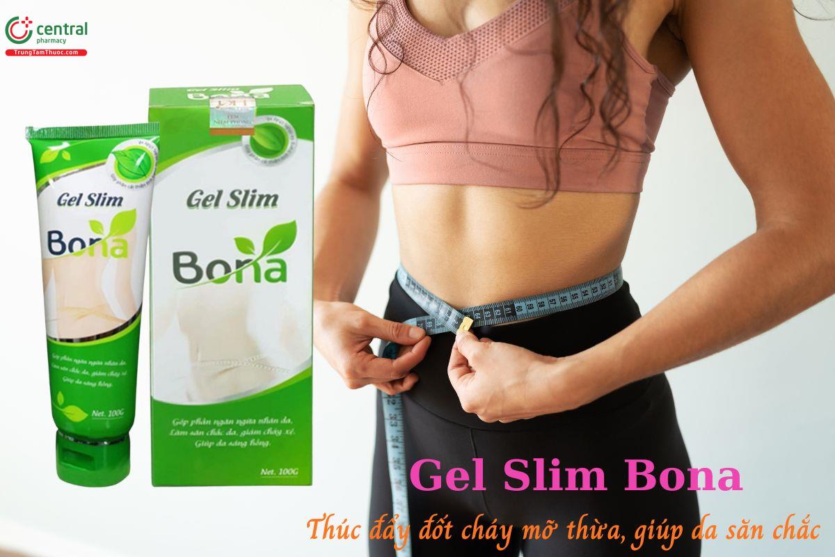 - Gel Slim Bona với sự kết hợp của tinh dầu gừng, tinh dầu quế, tinh dầu hạnh nhân, chiết xuất nho biển mang lại cảm giác ấm nóng sau khi bôi, hỗ trợ đốt cháy mỡ thừa, đồng thời giúp da săn chắc, đàn hồi, hạn chế tình trạng chảy xệ sau giảm cân.