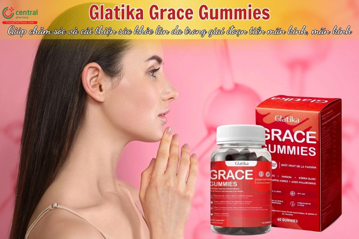 Viên nhai Glatika Grace Gummies giúp chăm sóc và cải thiện sức khỏe làn da ở phụ nữ trong giai đoạn tiền mãn kinh và mãn kinh, khi nội tiết tố suy giảm khiến da khô, sạm và mất độ đàn hồi.
