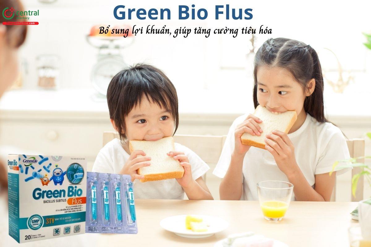 Green Bio Flus dùng cho trẻ nhỏ, người lớn bị loạn khuẩn đường ruột do dùng kháng sinh hoặc do các nguyên nhân khác gây rối loạn tiêu hóa có các triệu chứng như: tiêu chảy, đi ngoài phân sống, khó tiêu, bụng đầy chướng, táo bón,...