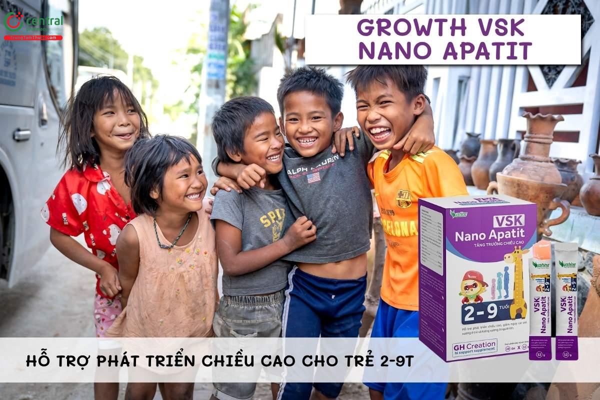 - Các thành phần như canxi, Vitamin D3 và Vitamin K2 trong Growth VSK Nano Apatit giúp hỗ trợ quá trình hình thành và phát triển xương, từ đó thúc đẩy sự phát triển chiều cao cho trẻ, đặc biệt trong giai đoạn từ 2 - 9 tuổi.