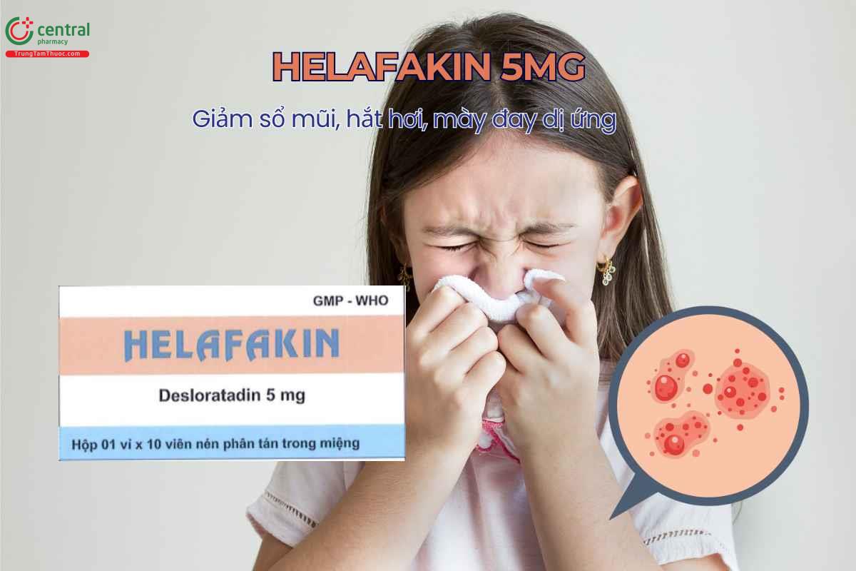 - Thuốc Helafakin 5mg giúp giảm nhanh các triệu chứng dị ứng do viêm mũi dị ứng hoặc mày đay tự phát, đảm bảo an toàn và hiệu quả ở trẻ em trên 12 tuổi và người lớn.
