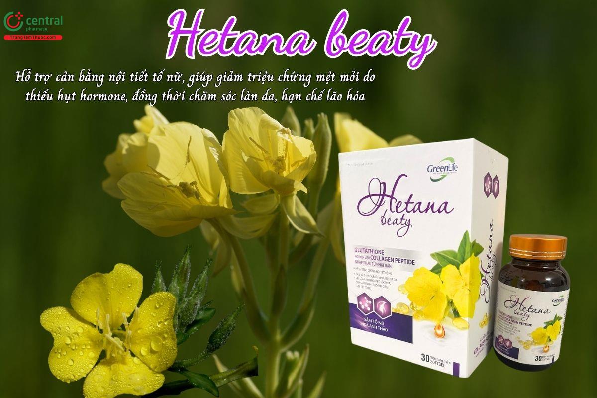 Viên uống Hetana beaty được thiết kế để hỗ trợ cân bằng nội tiết tố nữ, giúp giảm các dấu hiệu mệt mỏi do thiếu hụt hormone, đồng thời chăm sóc làn da, hạn chế lão hóa, hỗ trợ chu kỳ kinh nguyệt ổn định và giảm hiện tượng bốc hỏa. Sản phẩm còn giúp tăng cường sức khỏe tổng thể và duy trì sự tươi trẻ cho phụ nữ.