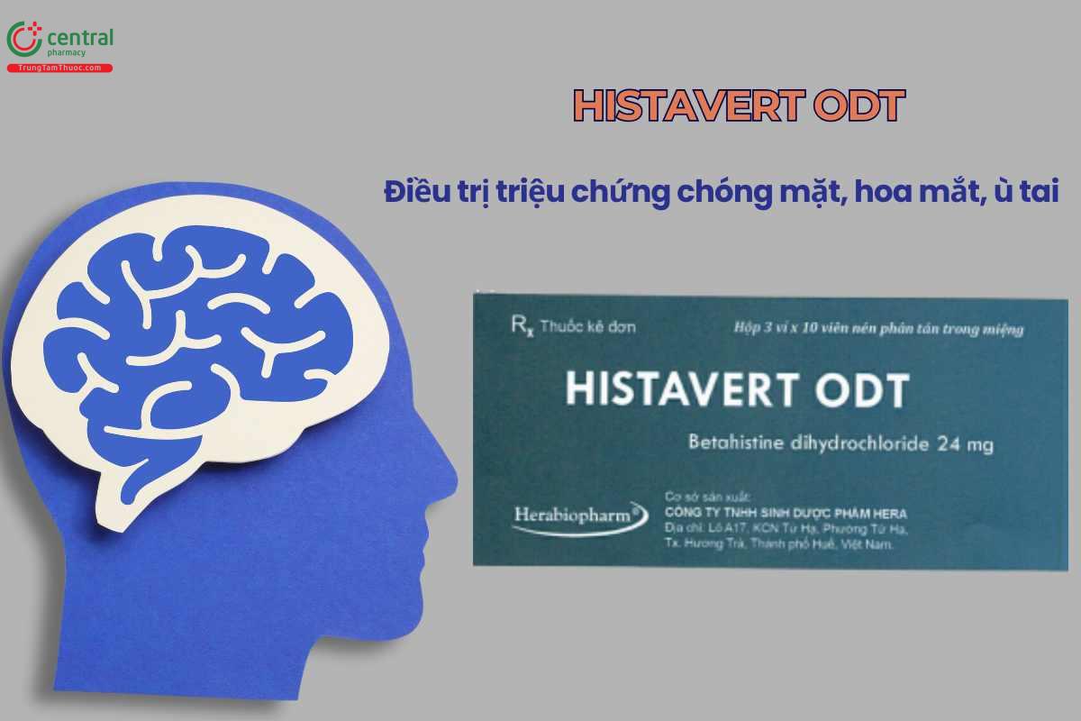 - Thuốc Histavert ODT 24mg với thành phần betahistine giảm triệu chứng ù tai, chóng mặt tái phát ở người lớn và người cao tuổi.