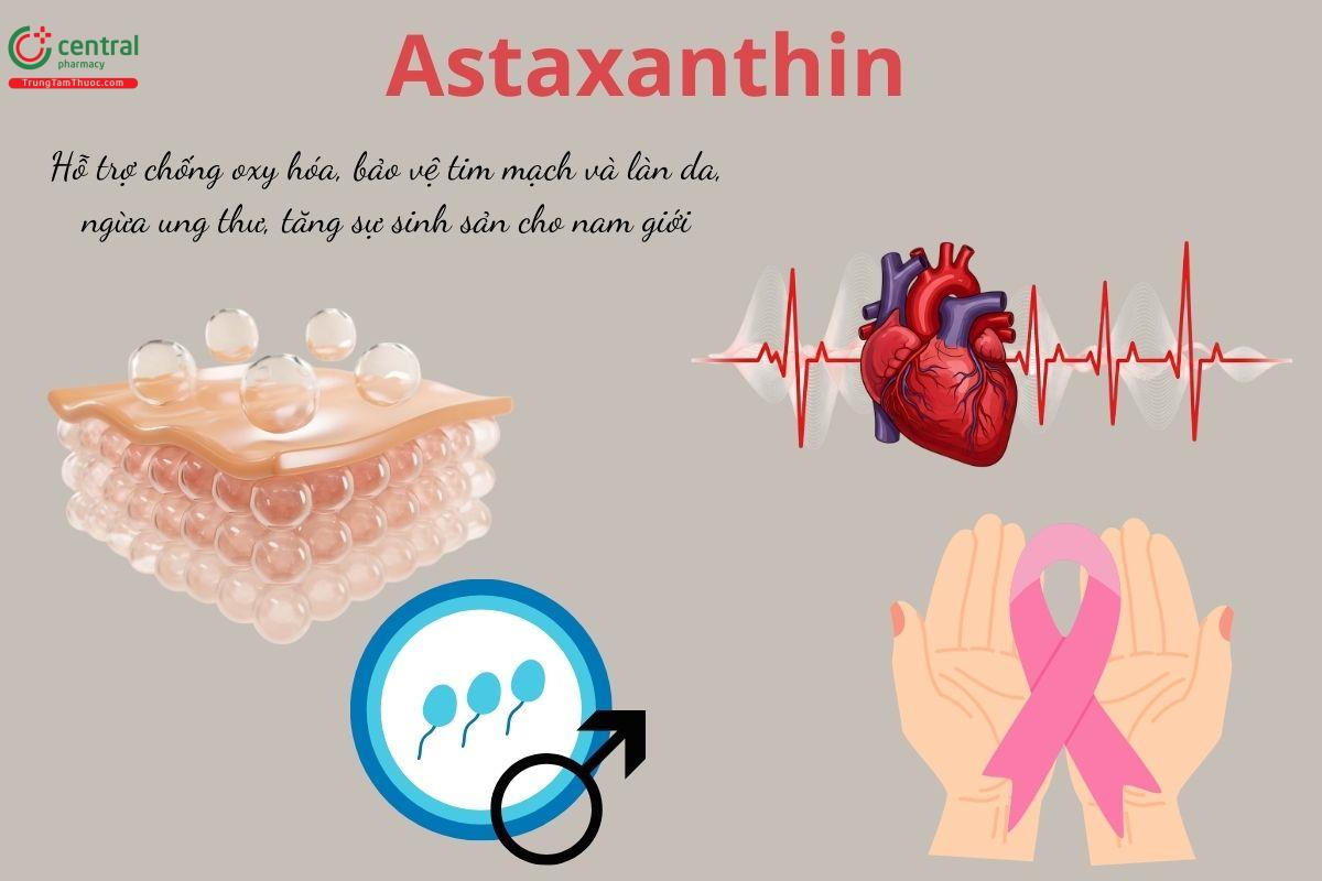 | Bảo vệ tim mạch | Các bệnh tim mạch là nguyên nhân phổ biến nhất gây tử vong trên toàn thế giới. Astaxanthin là một Carotenoid có vai trò trong việc chống oxy hóa có thể được sử dụng để ngăn ngừa sự tiến triển hoặc như một chất bổ trợ trong điều trị các bệnh tim mạch. Một số lợi ích về mạch máu bởi tác dụng chống oxy hóa của astaxanthin đã được báo cáo trong một nghiên cứu mở trên 20 phụ nữ sau mãn kinh có tỷ lệ stress oxy hóa cao. Sau 8 tuần bổ sung 12 mg astaxanthin, đã giảm đáng kể lần lượt 4,64 và 6,93% trị số huyết áp tâm thu và tâm trương. Tuần hoàn máu rất quan trọng đối với cân bằng nội môi tim mạch. Astaxanthin đã được chứng minh là làm giảm thời gian vận chuyển máu ở người. Trong nghiên cứu, những người được bổ sung 6 mg astaxanthin trong 10 ngày có thời gian vận chuyển máu chậm hơn đáng kể so với trước khi chưa bổ sung. Một nghiên cứu chứng minh rằng, sau 12 tuần bổ sung 20 mg astaxanthin đã làm giảm stress oxy hóa và điều chỉnh thành phần lipid ở những người thừa cân và béo phì, giảm nguy cơ phát triển các bệnh tim mạch. |