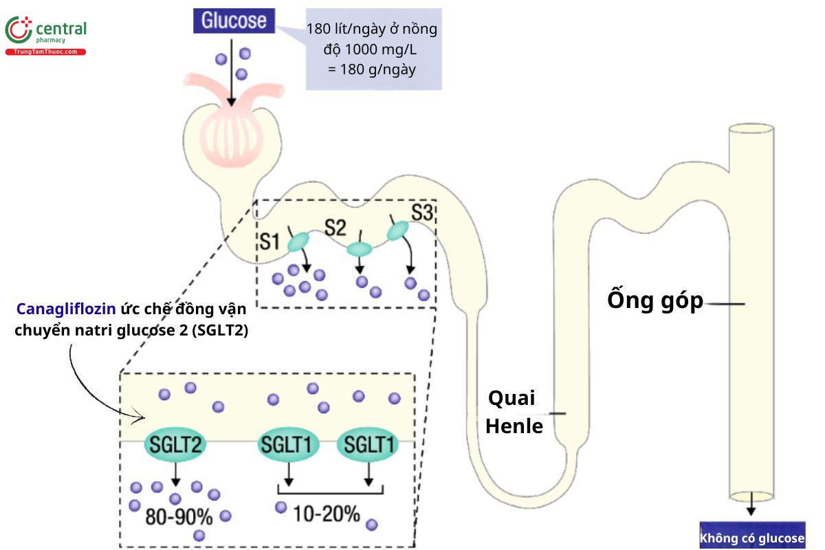 Cơ chế hoạt động: SGLT2 nằm ở ống lượn gần thận và đóng vai trò chính trong tái hấp thu Glucose từ dịch lọc. Canagliflozin ức chế SGLT2, làm giảm quá trình tái hấp thu glucose đã được lọc và làm giảm ngưỡng thận đối với glucose, từ đó làm tăng bài tiết glucose qua nước tiểu. Ngoài ra, thuốc làm tăng lượng natri đến ống lượn xa doức chế sự tái hấp thu glucose và natri phụ thuộc SGLT2. Từ đó tăng phản hồi ống - cầu thận và góp phần giảm áp lực trong cầu thận.