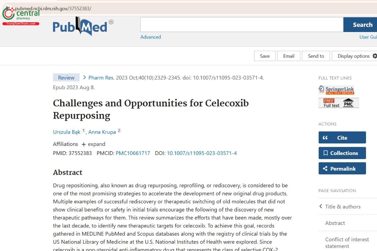 - Bąk U và cộng sự (Ngày đăng: Tháng 10 năm 2023). Challenges and Opportunities for Celecoxib Repurposing. Pubmed. Truy cập ngày 8 tháng 11 năm 2025.