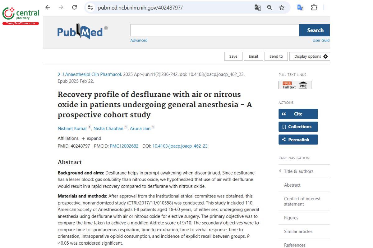 - Kumar N, Chauhan N, Jain A (Ngày đăng: Tháng 4-6 năm 2025), Recovery profile of desflurane with air or nitrous oxide in patients undergoing general anesthesia - A prospective cohort study, pubmed. Truy cập ngày 25 tháng 12 năm 2025.