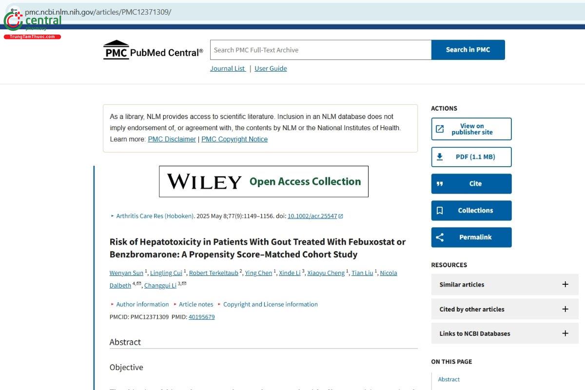 - Sun W, Cui L, Terkeltaub R, Chen Y, Li X, Cheng X, Liu T, Dalbeth N, Li C (Ngày đăng: Tháng 9 năm 2025). Risk of Hepatotoxicity in Patients With Gout Treated With Febuxostat or Benzbromarone: A Propensity Score–Matched Cohort Study. Pubmed. Truy cập ngày 8 tháng 11 năm 2025.