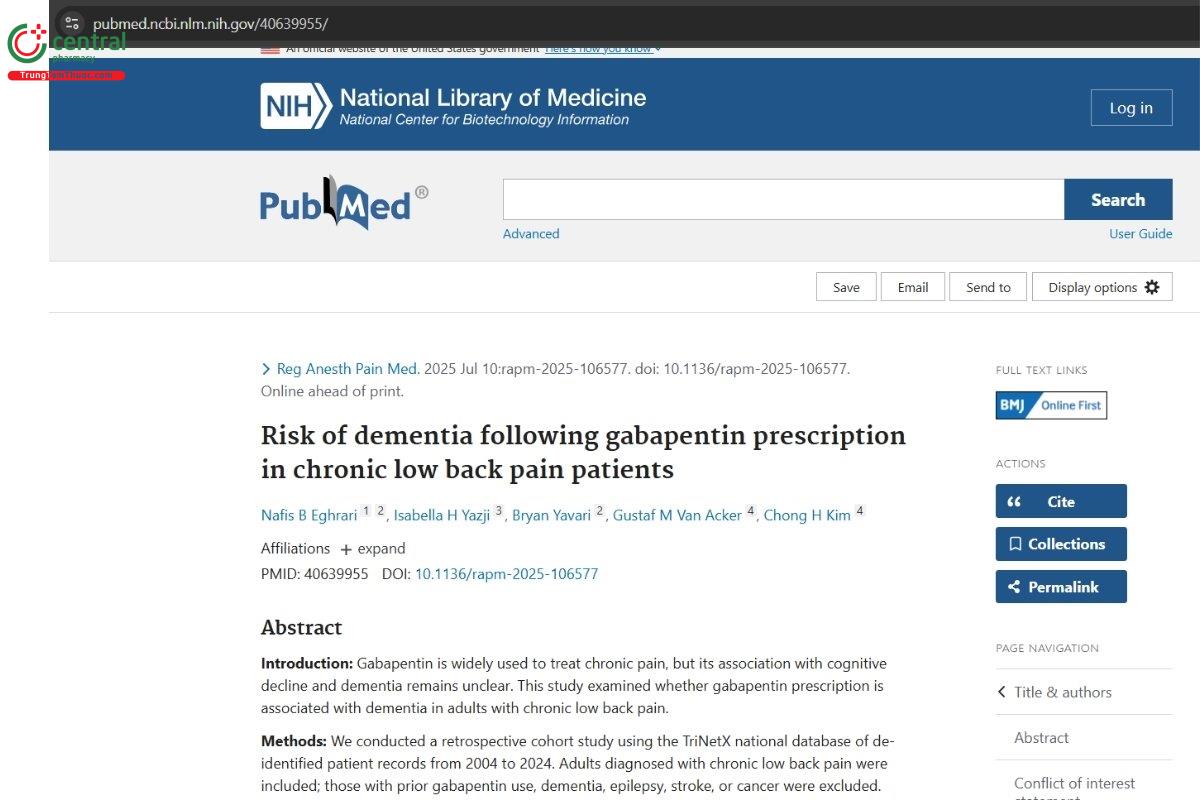 - Eghrari NB, Yazji IH, Yavari B, Van Acker GM, Kim CH (Ngày đăng: Ngày 10 tháng 7 năm 2025), Risk of dementia following gabapentin prescription in chronic low back pain patients, pubmed. Truy cập ngày 24 tháng 11 năm 2025.