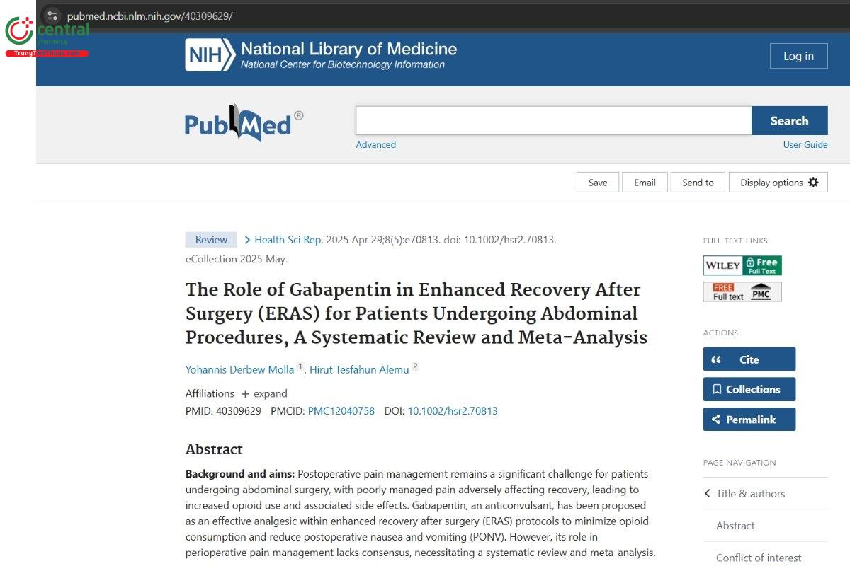 - Molla YD, Alemu HT (Ngày đăng: Ngày 29 tháng 4 năm 2025), The Role of Gabapentin in Enhanced Recovery After Surgery (ERAS) for Patients Undergoing Abdominal Procedures, A Systematic Review and Meta-Analysis, pubmed. Truy cập ngày 24 tháng 11 năm 2025.