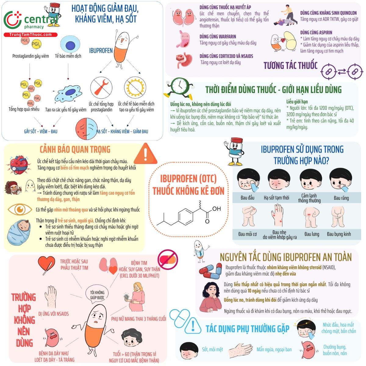 Ibuprofen là thuốc chống viêm không steroid có tác dụng an toàn nhất trong nhóm này, được chỉ định trong việc điều trị chống viêm và giảm đau từ mức độ nhẹ đến vừa như thống kinh, đau đầu, đau răng, hạ sốt, viêm khớp dạng thấp, viêm khớp thiếu niên,…