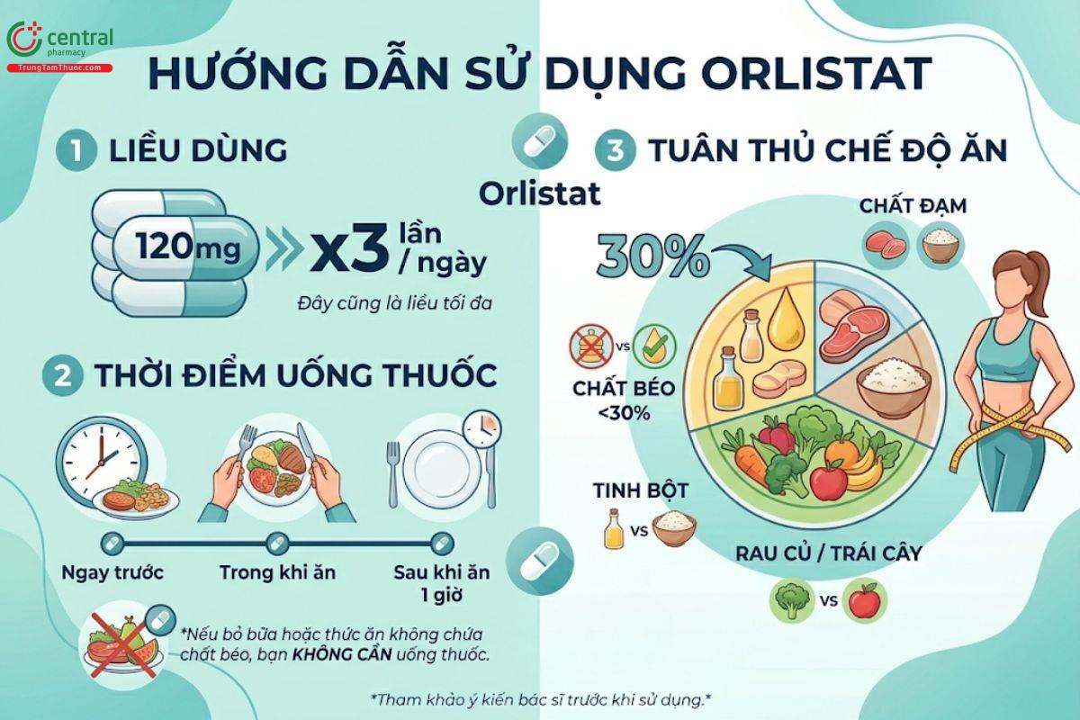 Orlistat nên uống ngay trước, trong khi ăn hoặc sau khi ăn bữa ăn giàu chứa chất béo khoảng 1 giờ.