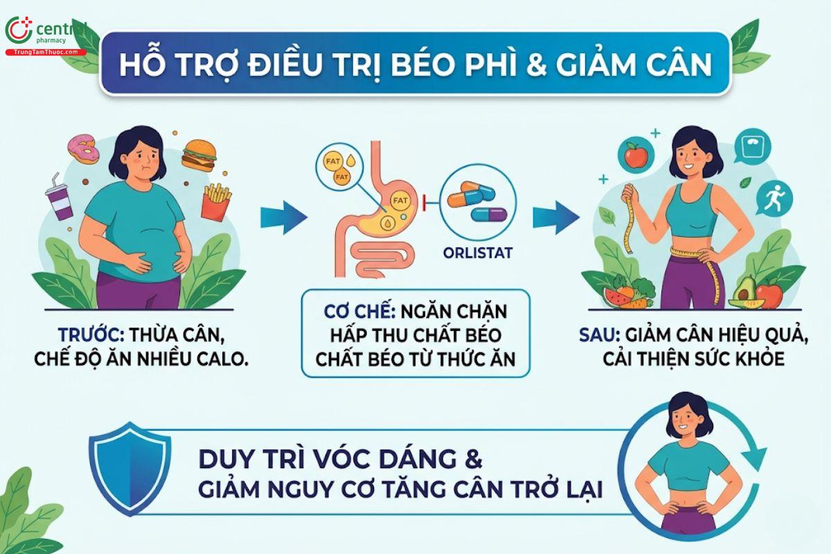 Orlistat được chỉ định cho những bệnh nhân có chỉ số khối cơ thể (BMI) ít nhất là 30 kg/m2 hoặc 28 kg/m2 khi có các biến chứng liên quan đến béo phì, chẳng hạn như tăng huyết áp, đái tháo đường, tăng lipid máu và ngưng thở khi ngủ do tắc nghẽn. Trong các thử nghiệm lâm sàng, orlistat (120mg ngày 1 lần) kết hợp với thay đổi lối sống và chế độ ăn ít calo (30% năng lượng từ chất béo) giúp giảm cân nhiều hơn đáng kể và cải thiện các biến chứng sức khỏe do béo phì (tiểu đường, tăng huyết áp, tăng lipid máu) so với bệnh nhân chỉ điều chỉnh ăn uống.