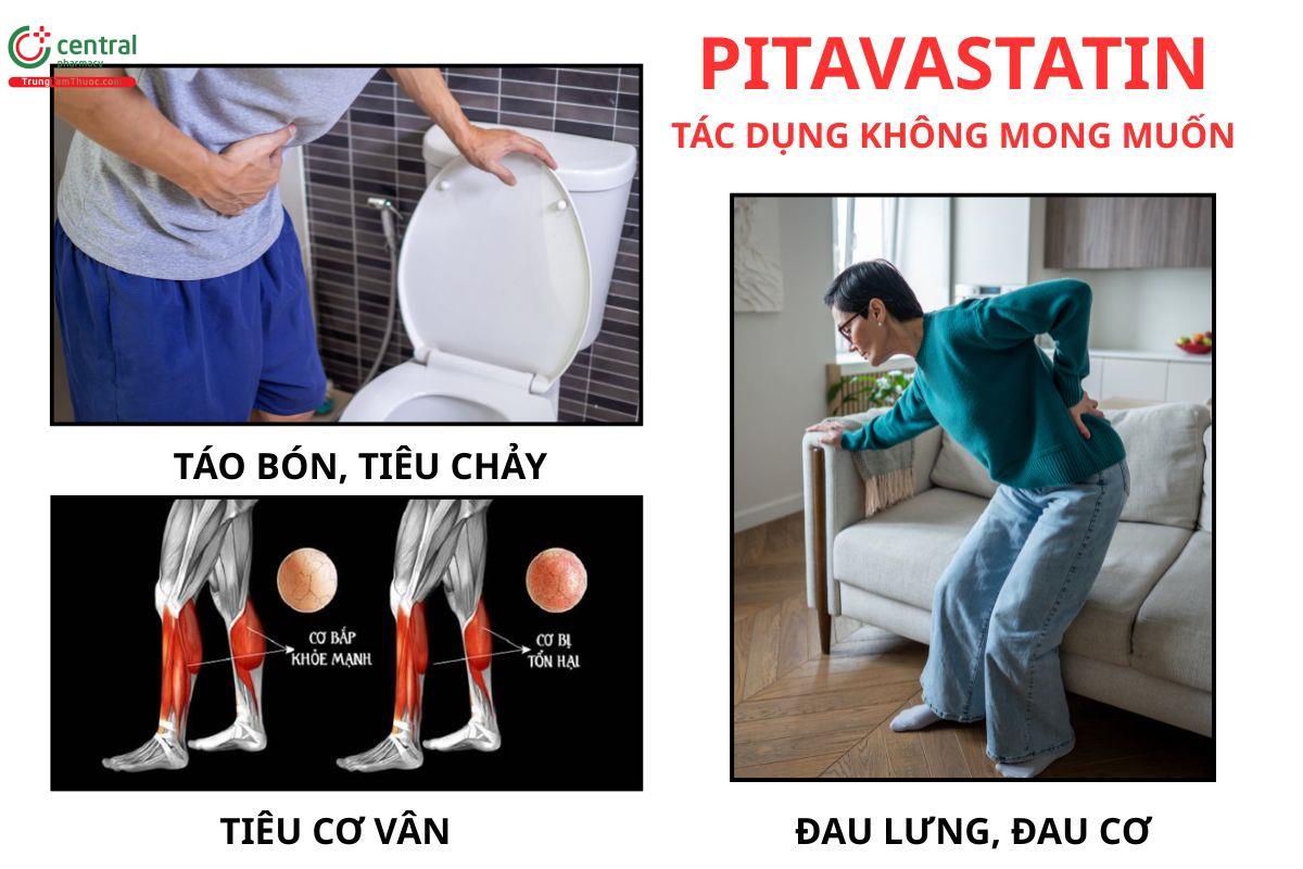 Pitavastatin có thể gây đau cơ, yếu cơ, viêm cơ và hiếm gặp tiêu cơ vân, vì vậy người dùng cần thông báo ngay khi xuất hiện các triệu chứng bất thường ở cơ.