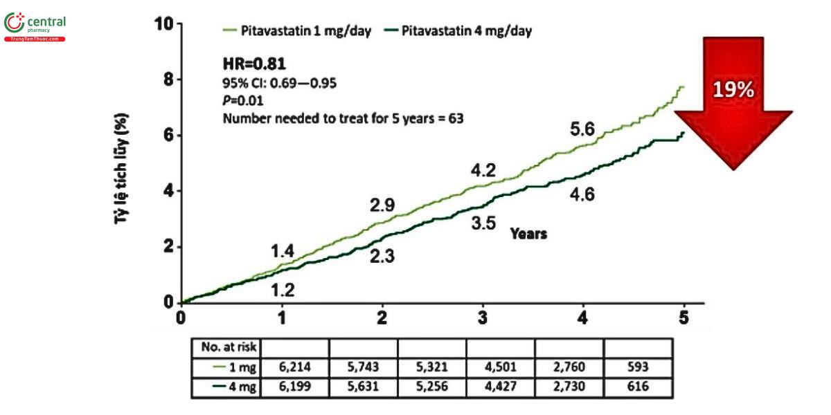 → Pitavastatin 4 mg/ngày vượt trội hơn so với pitavastatin 1 mg/ngày, giảm 19% biến cố tim mạch (MACE).