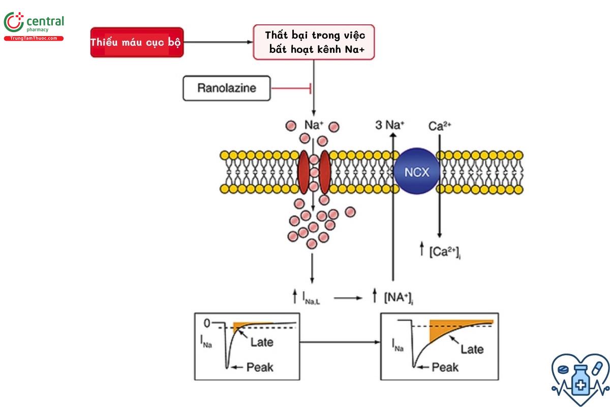 Bằng cách giảm quá tải ion, ranolazin làm giảm sự mất cân bằng ion nội bào trong tình trạng thiếu máu cục bộ. Ranolazin góp phần cải thiện sự giãn của cơ tim trong thì tâm trương, giúp giảm độ cứng của thất trái.