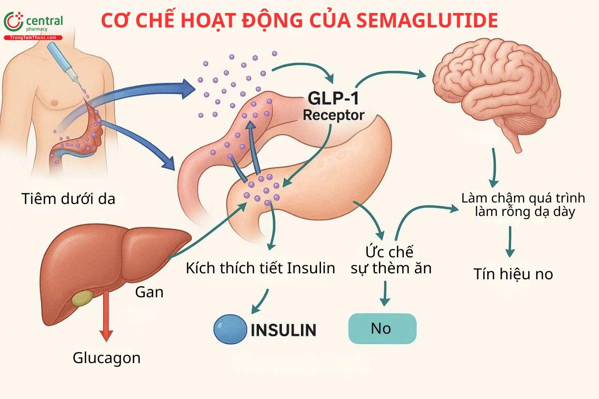 Khi kích hoạt thụ thể GLP-1, semaglutide làm tăng tiết Insulin phụ thuộc glucose, cung cấp phản ứng sinh lý đối với lượng Glucose trong máu tăng cao sau bữa ăn. Đồng thời, semaglutide làm chậm quá trình làm rỗng dạ dày, tăng sinh tế bào β tuyến tụy và làm giảm giải phóng glucagon, góp phần làm giảm cảm giác thèm ăn nói chung.