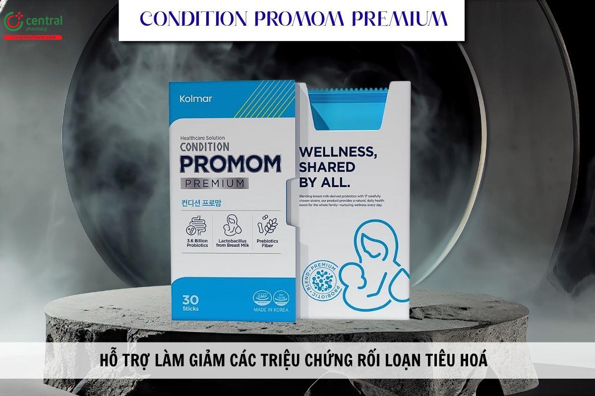 Kolmar Condition Promom Premium sử dụng cho trẻ em từ 1 tuổi trở lên và người lớn gặp vấn đề rối loạn tiêu hoá hoặc có nhu cầu bổ sung lợi khuẩn, hỗ trợ cân bằng hệ vi sinh đường ruột và tăng cường sức đề kháng.