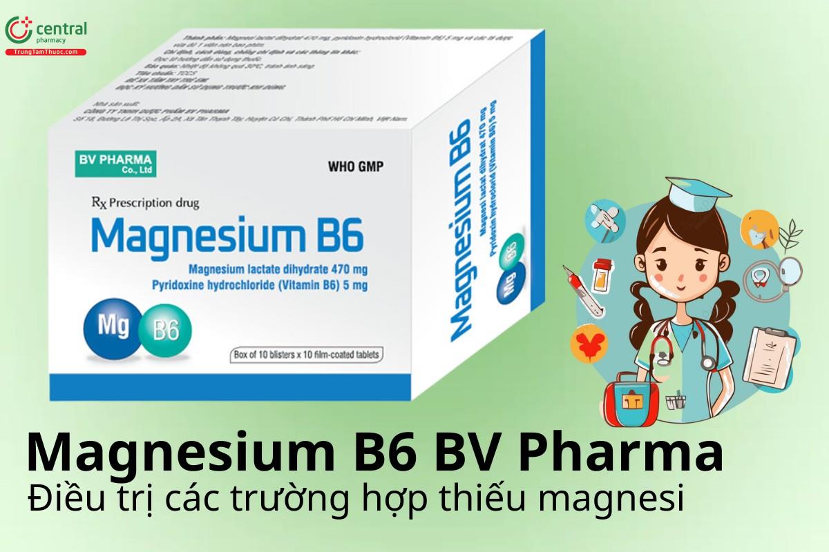 Magnesium B6 BV Pharma bổ sung Magnesi và Pyridoxine. Magnesi giúp điều hòa tính kích thích thần kinh - cơ, làm giảm các triệu chứng liên quan đến thiếu hụt Magnesi như co thắt cơ và các rối loạn tâm thần nhẹ (lo âu, rối loạn giấc ngủ). Pyridoxine (Vitamin B6) là coenzyme quan trọng trong chuyển hóa, đồng thời hiệp đồng tăng cường hiệu quả sử dụng Magnesi. [1]