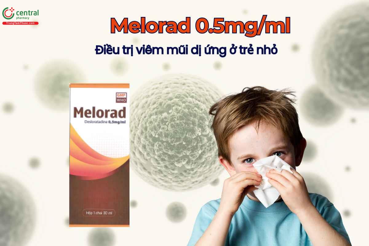 Thuốc Melorad 0.5mg/ml được chỉ định ở người lớn và trẻ em từ 1 tuổi trở lên điều trị triệu chứng viêm mũi dị ứng như hắt hơi, sổ mũi, chảy nước mắt, xung huyết, nghẹt mũi… Đồng thời thuốc cũng được chỉ định để giảm các triệu chứng ngứa, nổi ban liên quan đến mày đay. [1]