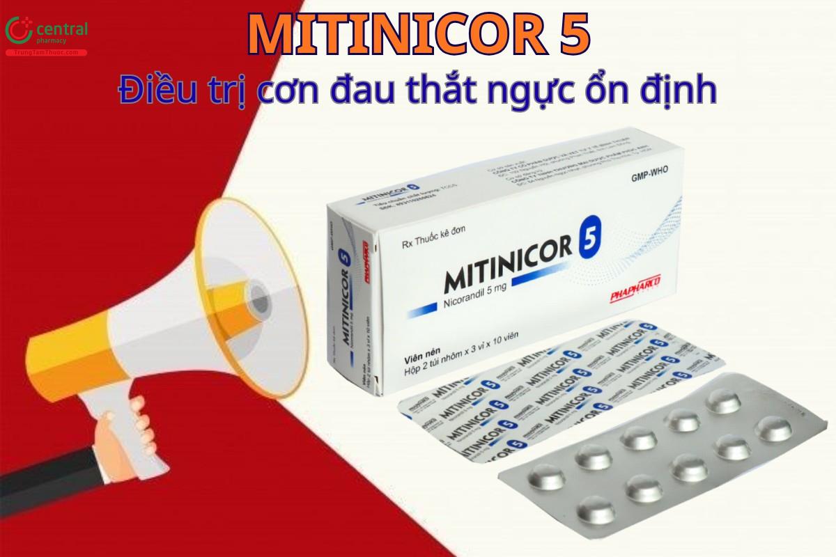 Viên nén MITINICOR 5 được sử dụng để điều trị cơn đau thắt ngực ổn định ở người lớn, đặc biệt là những bệnh nhân không được kiểm soát đầy đủ hoặc có chống chỉ định, hoặc không dung nạp với các liệu pháp điều trị đầu tay khác (như thuốc chẹn beta và/hoặc thuốc chẹn kênh calci).[1]