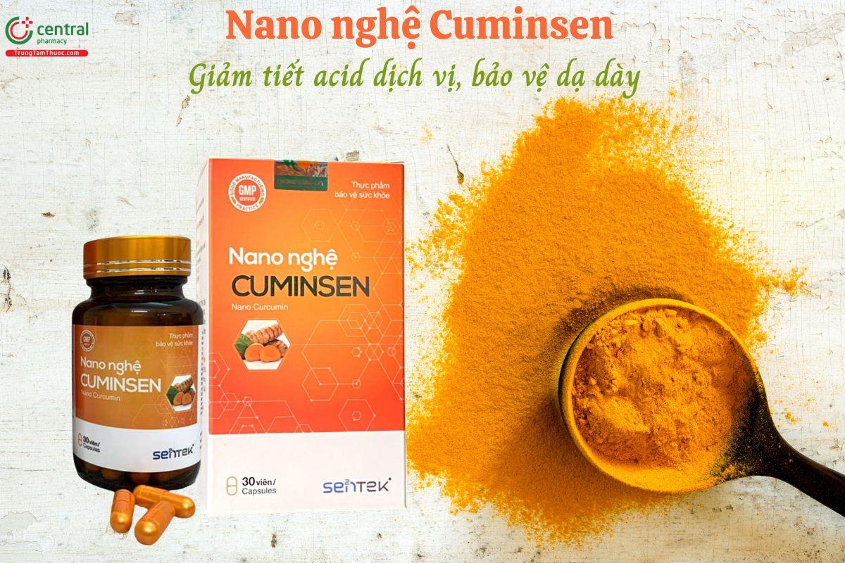- Nano nghệ Cuminsen với thành phần chính là Nano Curcumin giúp giảm tiết acid dịch vị, bảo vệ niêm mạc dạ dày đồng thời làm giảm các triệu chứng do viêm loét dạ dày – tá tràng gây ra.