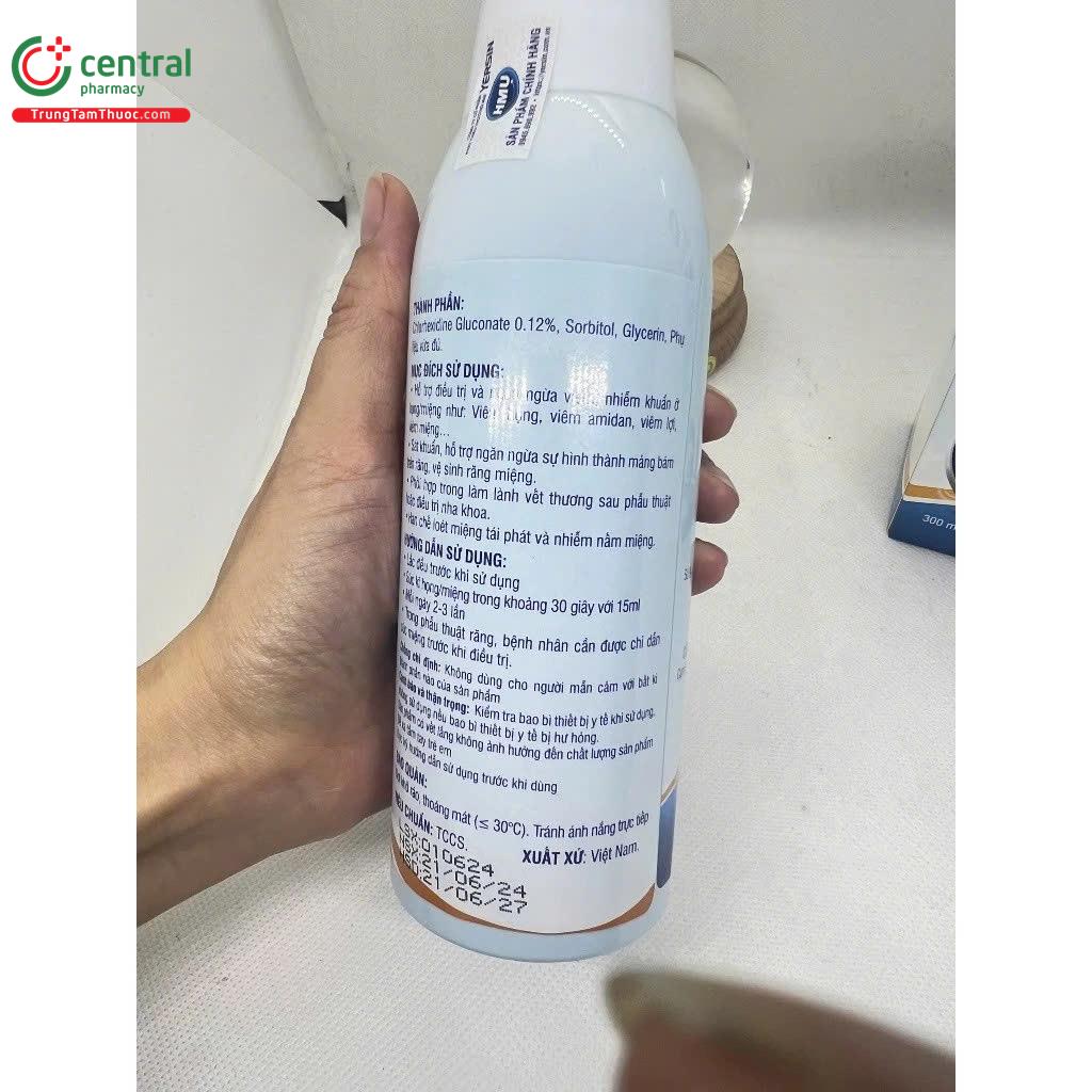 - Nước súc miệng này có chứa thành phần Chlorhexidine với hàm lượng phù hợp cho sát khuẩn khoang miệng, đã có nghiên cứu và cho thấy thành phần này có công dụng hỗ trợ tốt trong chăm sóc răng miệng và sau điều trị nha khoa.