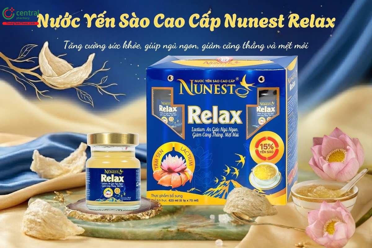 Với sự kết hợp yến sào tự nhiên cùng Lactium và cao tâm sen, Nước Yến Sào Cao Cấp Nunest Relax giúp hỗ trợ giảm căng thẳng, an dịu thần kinh và cải thiện chất lượng giấc ngủ. Sản phẩm giúp dễ ngủ và ngủ sâu hơn mà không gây phụ thuộc, đồng thời bổ sung dưỡng chất giúp bồi bổ cơ thể, giảm mệt mỏi và tăng cường sức khỏe.