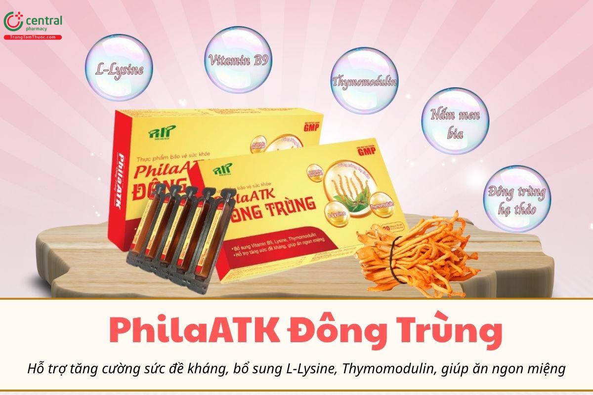 - PhilaATK Đông Trùng có công thức kết hợp Đông trùng hạ thảo cùng các dưỡng chất cần thiết, giúp hỗ trợ tăng cường sức đề kháng và cải thiện thể trạng.
