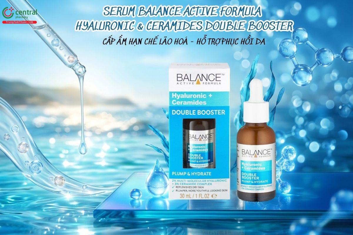 - Serum Balance Active Formula Hyaluronic & Ceramides Double Booster có công thức tập trung vào cấp ẩm với sự kết hợp của Hyaluronic Acid và ceramide, giúp da duy trì độ ẩm tốt hơn và giảm cảm giác khô căng thường gặp.