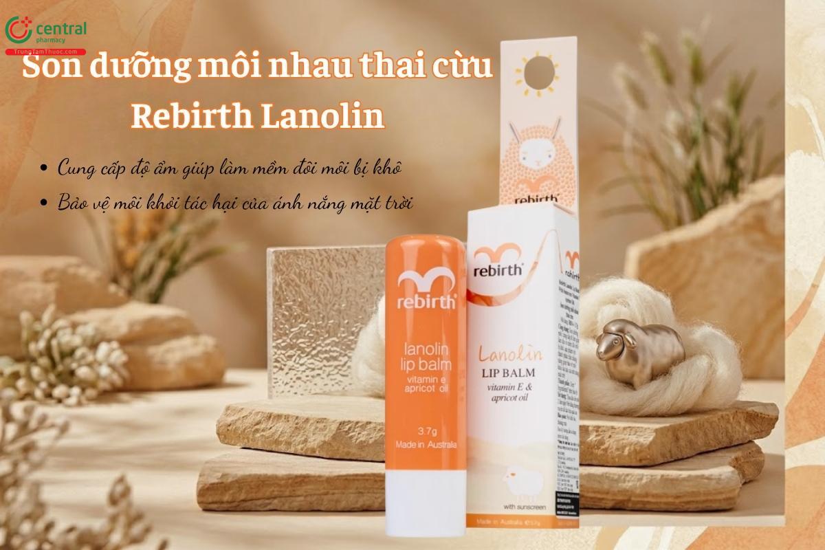 Rebirth Lanolin Lip Balm có chứa kem chống nắng, vitamin E và dầu hạt mơ giúp bổ sung độ ẩm, hỗ trợ làm mềm và làm dịu tình trạng môi khô, nứt nẻ. Đồng thời hỗ trợ bảo vệ môi khỏi mất độ ẩm và tác hại của tia UV.