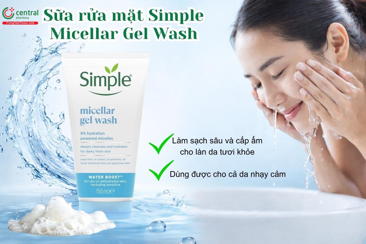 Sữa rửa mặt Simple Micellar Gel Wash giúp làm sạch sâu, loại bỏ dầu thừa, bã nhờn và bụi bẩn trên da. Giúp bổ sung độ ẩm nhanh chóng, mang lại làn da mềm mại, căng mịn và tươi tắn sau khi rửa.