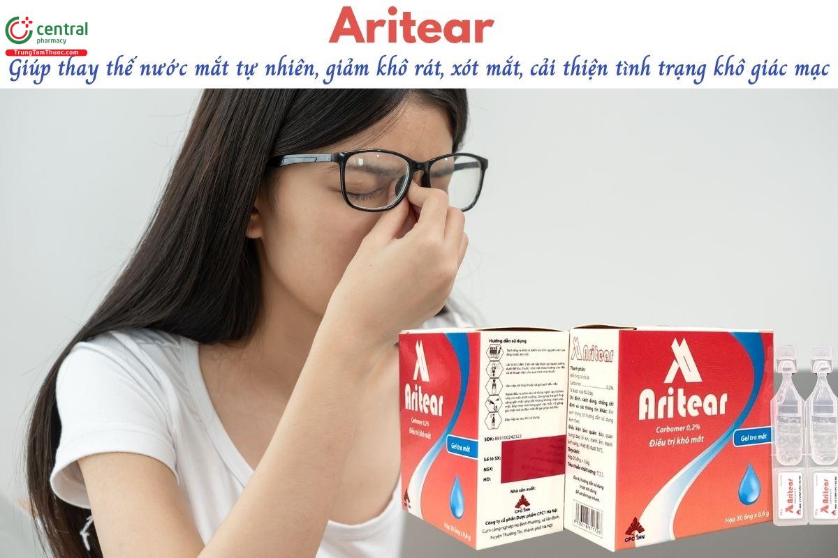 Gel tra mắt Aritear được sử dụng như Dung dịch thay thế nước mắt trong các trường hợp thiếu nước mắt, giúp giảm khô rát và kích ứng mắt, đồng thời hỗ trợ điều trị viêm kết – giác mạc khô và tình trạng màng phim nước mắt kém ổn định. [1]