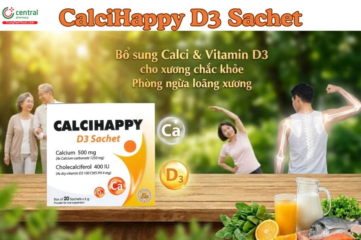 Thuốc CalciHappy D3 Sachet bổ sung calci và vitamin D3 cho cơ thể với những người có khẩu phần ăn thiếu hụt hai dưỡng chất này, người bị thiếu calci hoặc có nhu cầu calci tăng cao.