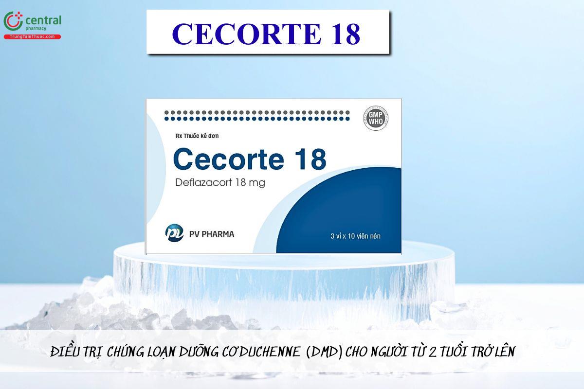 Cecorte 18 chứa Deflazacort thuộc nhóm Corticoid có nguồn gốc từ Prednisolone, với chỉ định điều trị chứng loạn dưỡng cơ Duchenne (DMD) ở trẻ từ 2 tuổi trở lên.