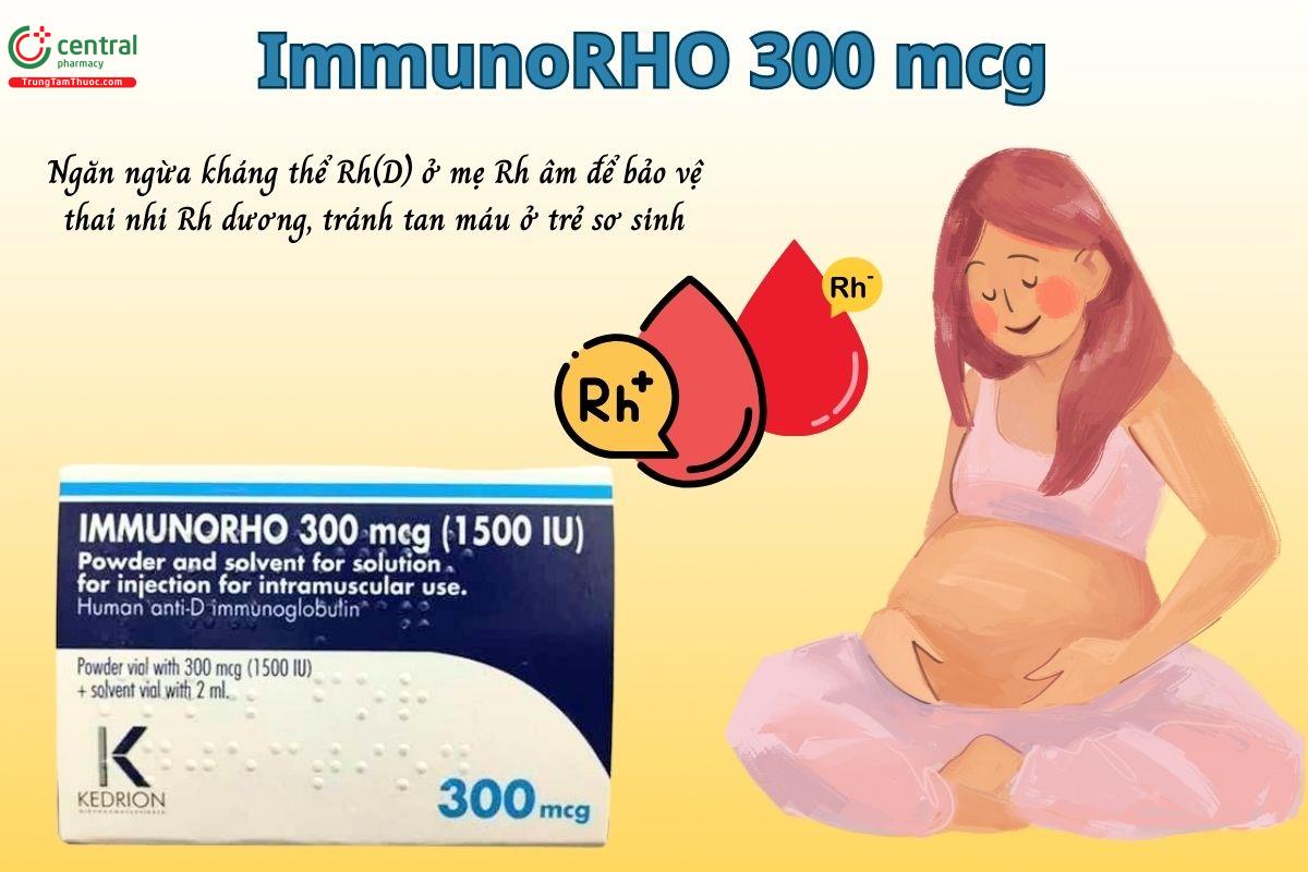 ImmunoRHO 300mcg 1500IU được sử dụng để ngăn ngừa hình thành kháng thể kháng Rh(D) ở những người có nhóm máu Rh âm, đặc biệt khi họ tiếp xúc với máu Rh dương, chẳng hạn như trong thai kỳ khi mẹ Rh âm mang thai thai nhi Rh dương.
