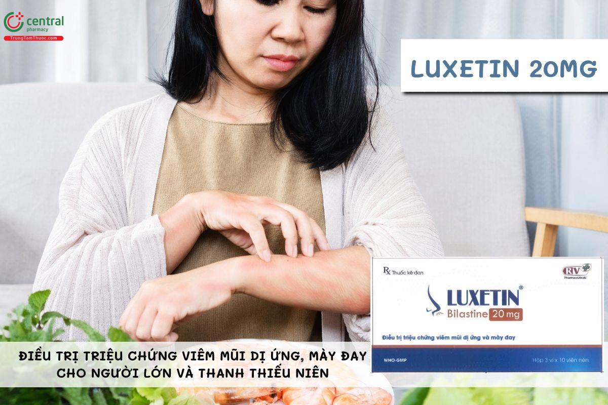 Thuốc Luxetin 20mg được chỉ định dùng cho người lớn và trẻ em từ 12 tuổi trở lên với mục đích điều trị triệu chứng viêm mũi dị ứng (quanh năm hoặc theo mùa) và mày đay.[1]