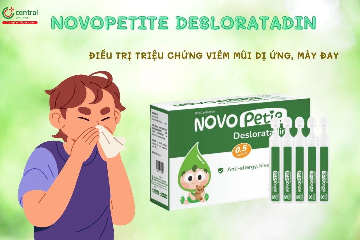 - Thuốc Novopetite Desloratadin chứa Desloratadin có tác động chọn lọc lên thụ thể H1 ngoại vi, giúp kiểm soát nhanh các triệu chứng viêm mũi dị ứng, mày đay mạn tính và viêm kết mạc dị ứng.