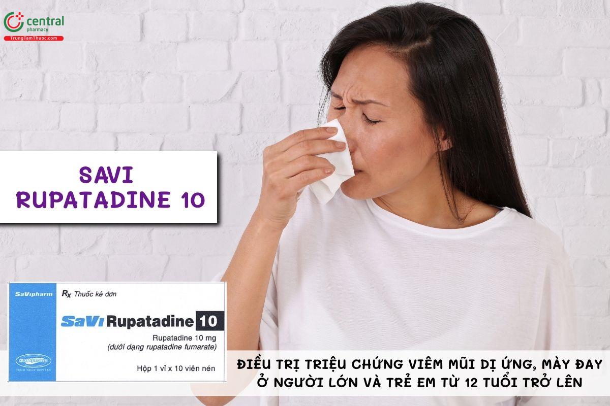 Thuốc SaVi Rupatadine 10 được sử dụng để làm giảm các biểu hiện của viêm mũi dị ứng và nổi mề đay ở người lớn cũng như trẻ em từ 12 tuổi trở lên.[1]