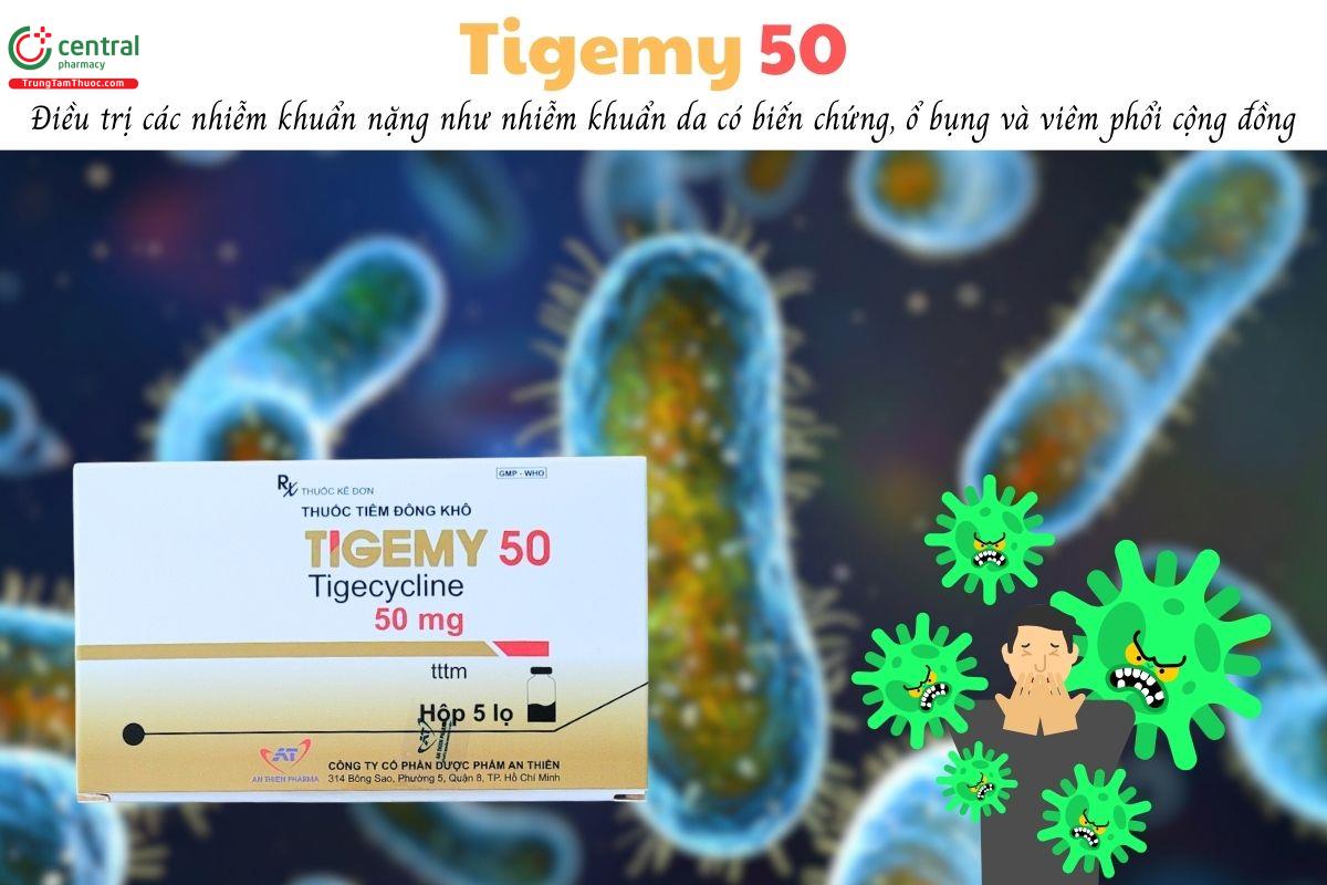 Thuốc Tigemy 50 được chỉ định trong điều trị các nhiễm khuẩn da và mô mềm có biến chứng, ngoại trừ trường hợp nhiễm trùng bàn chân ở người bệnh đái tháo đường. Đồng thời, thuốc còn được sử dụng cho các nhiễm khuẩn ổ bụng có biến chứng và viêm phổi mắc phải trong cộng đồng.