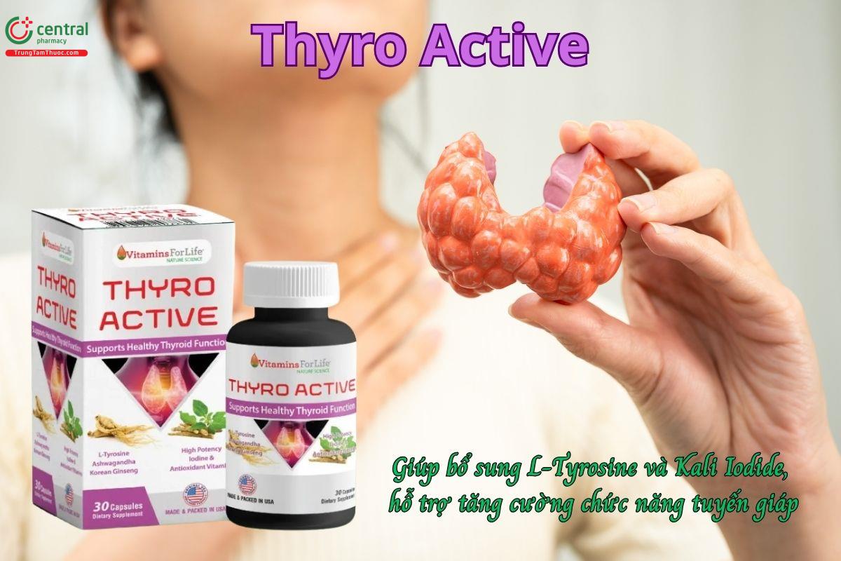 Viên uống Thyro Active giúp bổ sung L-Tyrosine và Kali Iodide, hỗ trợ tăng cường chức năng tuyến giáp, đồng thời bảo vệ sức khỏe và duy trì hoạt động ổn định của tuyến giáp.