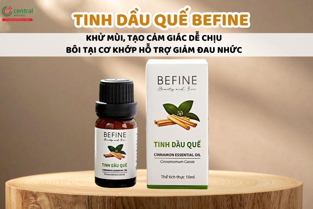 - Tinh dầu Vỏ Quế Befine được sản xuất bởi Công ty cổ phần Befine. Chiết xuất tinh dầu từ vỏ cây quế, đóng gói dạng hộp 1 lọ 10ml.